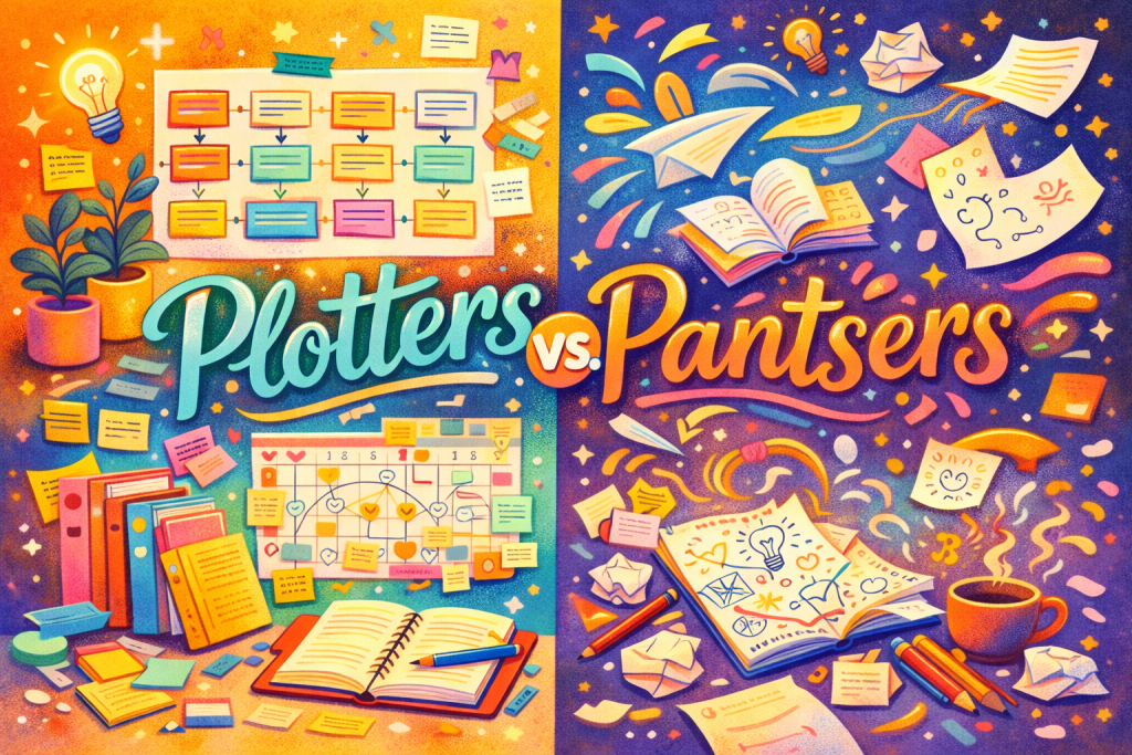 On one side, we have the Plotters — the writers with colour-coded spreadsheets, sticky notes spreading across walls like determined vines, and a clear map from “Chapter One” to “The End.” On the other side lurk the Pantsers — the brave souls who open a blank page, take a deep breath, and leap head-first into a story without a plan beyond let’s see what happens next.